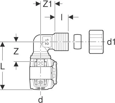 Geberit FlowFit Übergangswinkel 620701001 DN 15/12, Ø 20/15 Mm, 5,7 Cm, 90Grad, Mit Klemmringverschraubung